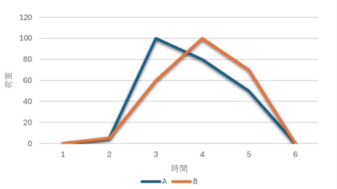 同じ衝撃を加えた場合でもAとBでは衝撃の受け方が異なります。Aは衝撃後、すぐに破断しましたが、Bは衝撃後に少し粘ってから破断しています。
